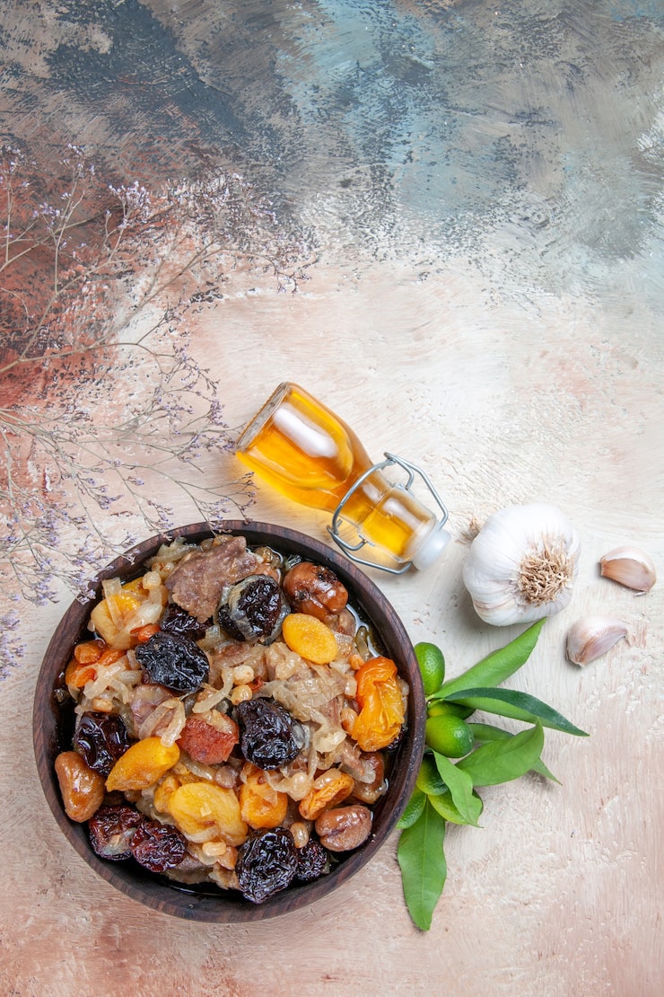 Я подготовила чернослив, курагу и несколько зубчиков чеснока. Большие фрукты разрезаю пополам.