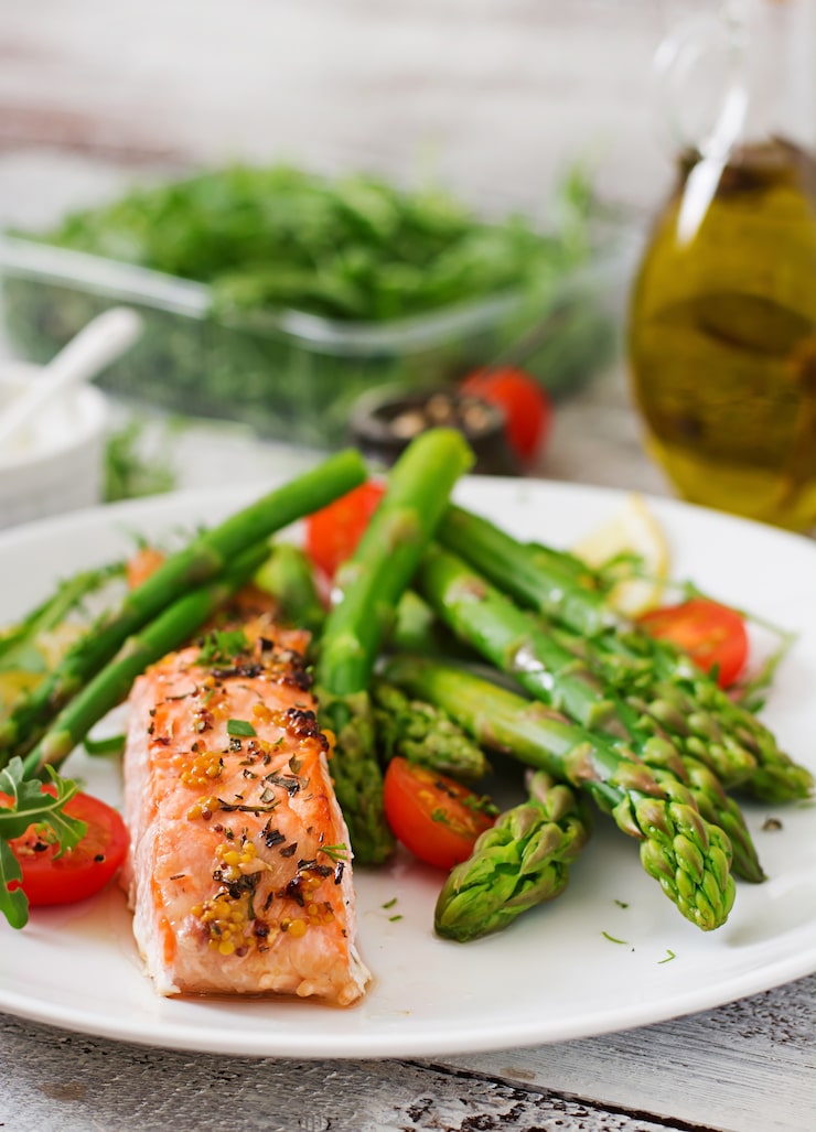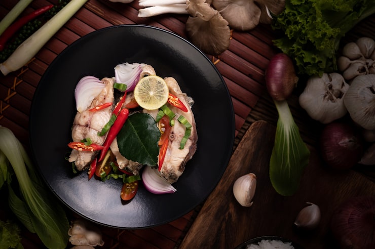 Филе трески, приготовленное на пару в соевом маринаде, с овощным гарниром