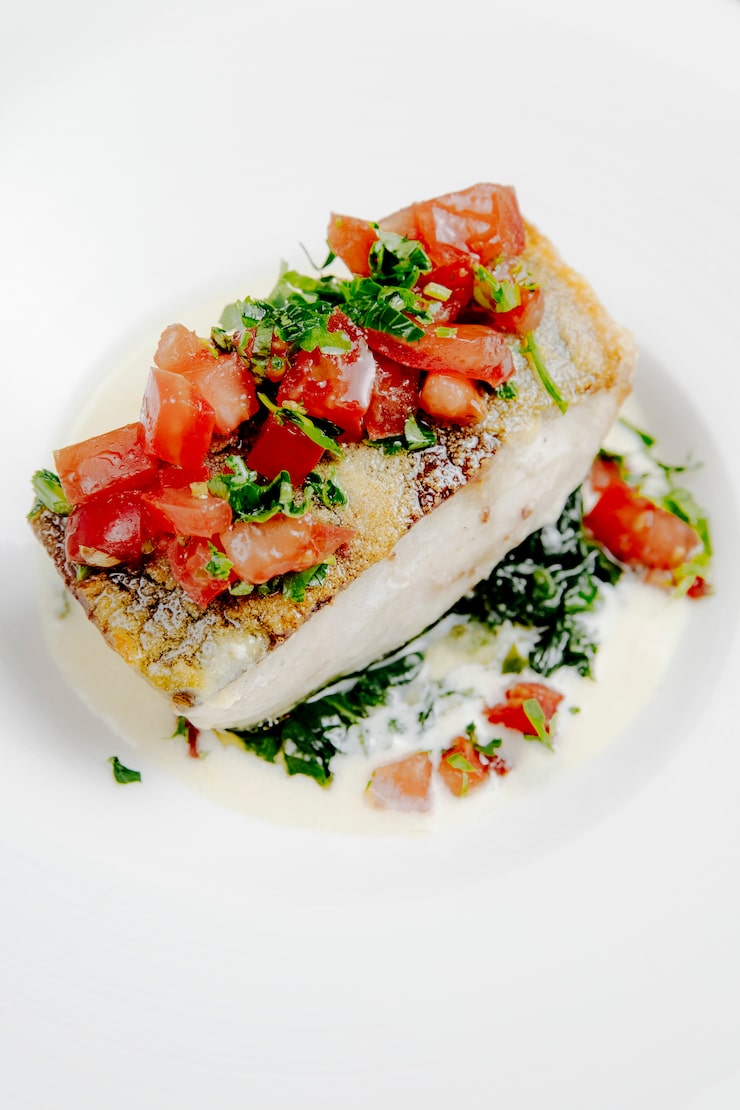 Сибас, запечённый на подушке из лука с прованскими травами и чесноком.