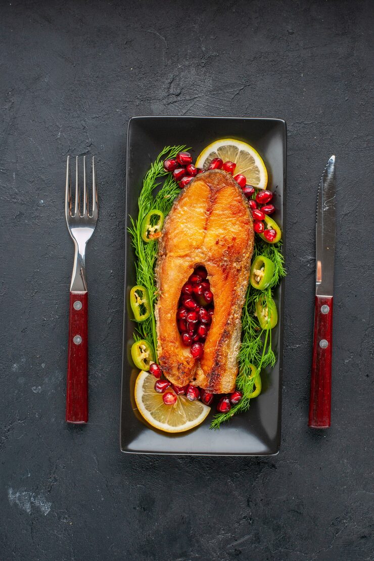 Дорадо, запечённая в специях, с нежным лимонным соусом.