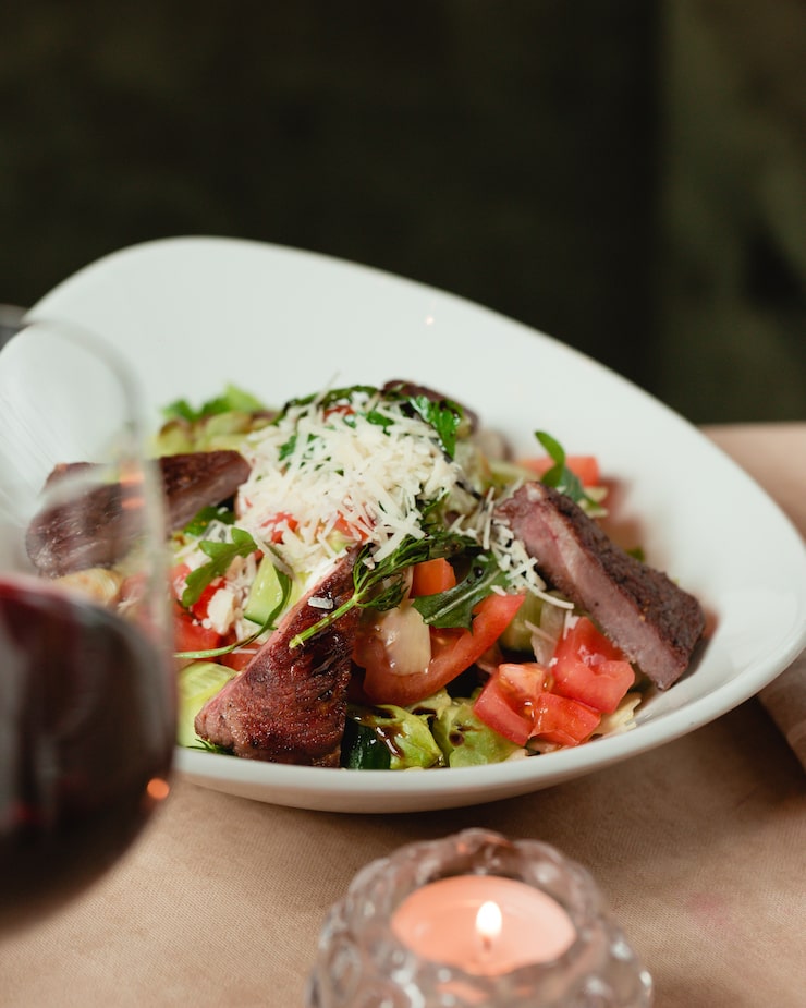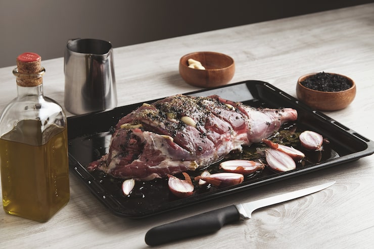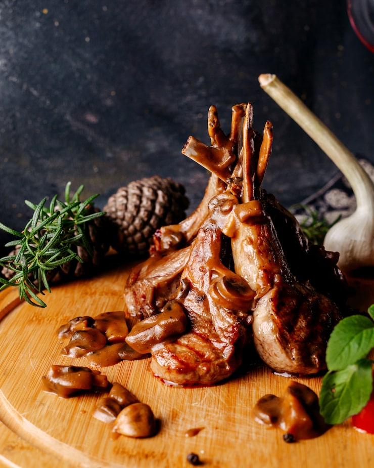 Баранина, тушенная в белом вине с грибами и помидорами.