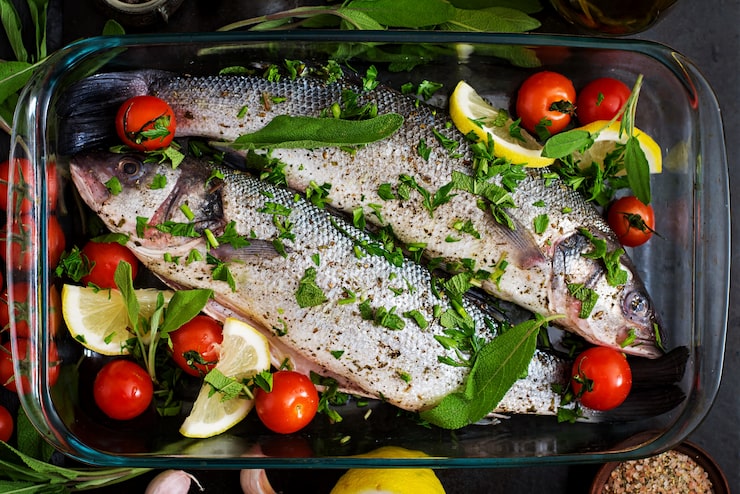 Рыбу помещаем в форму для запекания – это может быть керамическая посуда или противень, застеленный пергаментной бумагой).
