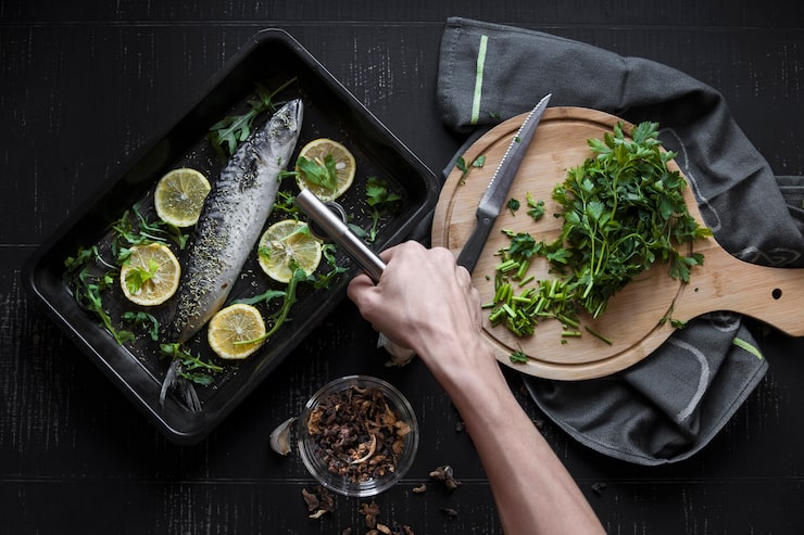 Скумбрию нарезают на порционные куски, помещают в миску и солят.