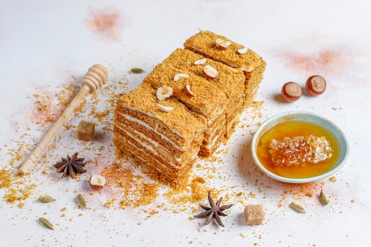 Каждый десерт покрывается медом, разведенным водой в соотношении один к одному, и посыпается крошкой, после чего украшается тортом.