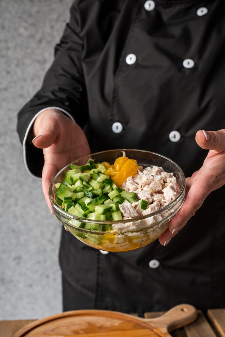 Обжаренное с обеих сторон до золотистой корочки филе нарезают и добавляют к остальным компонентам.