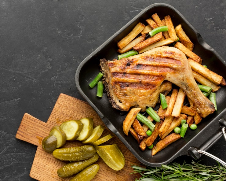 После приготовления куриная грудка выкладывается на тарелку, а также картофель и, при желании, ломтики огурца.
