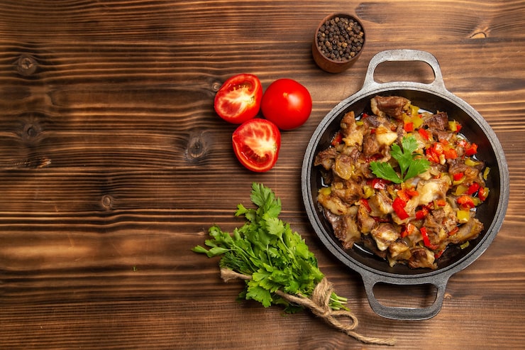 Грудинку нарезают кубиками размером 2 на 2 сантиметра, затем обжаривают без добавления масла, так как требуется, чтобы вытапливающийся жир обеспечивал обжаривание мяса со всех сторон.